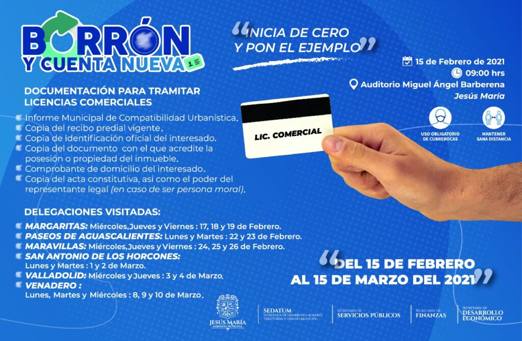 En apoyo a los negocios que se han visto afectados por la pandemia y como parte del compromiso que tiene esta administración con el impulso al desarrollo económico, la Presidencia Municipal de Jesús María a través de la Secretaría de Desarrollo Económico lanza la campaña “Borrón y Cuenta Nueva”.