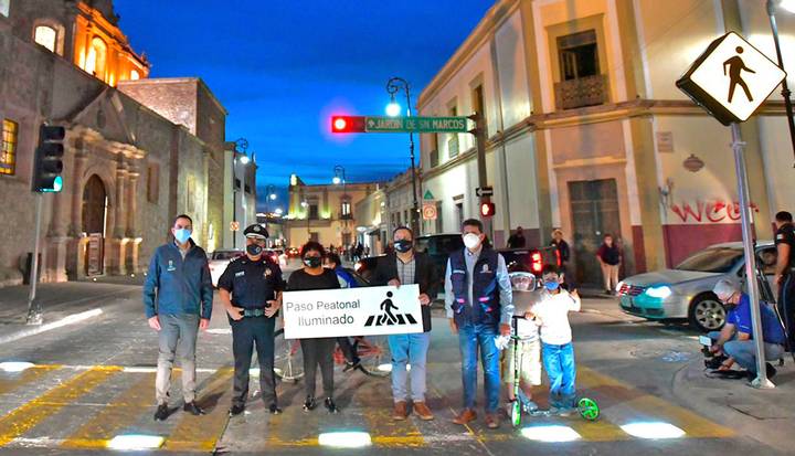 El Ayuntamiento de Aguascalientes instaló el primer paso peatonal iluminado en el cruce de las calles Moctezuma y Guadalupe Victoria del centro histórico, con el propósito de continuar dotando a la capital de infraestructura de vanguardia que además prioriza la movilidad y seguridad del peatón.