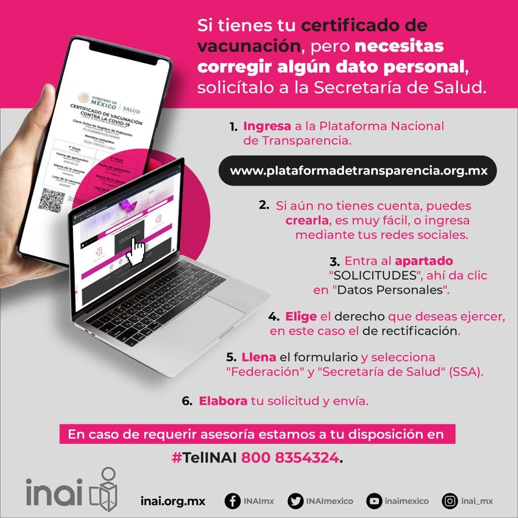El Instituto Nacional de Transparencia, Acceso a la Información y Protección de Datos Personales (INAI) llamó a los ciudadanos que hayan detectado algún error en los datos personales de su certificado de vacunación contra el COVID-19, a solicitar su corrección a la Secretaría de Salud. Para ello, la institución, a través de su cuenta oficial de Twitter, informó acerca del procedimiento para solicitar la corrección de datos personales erróneos en el certificado.