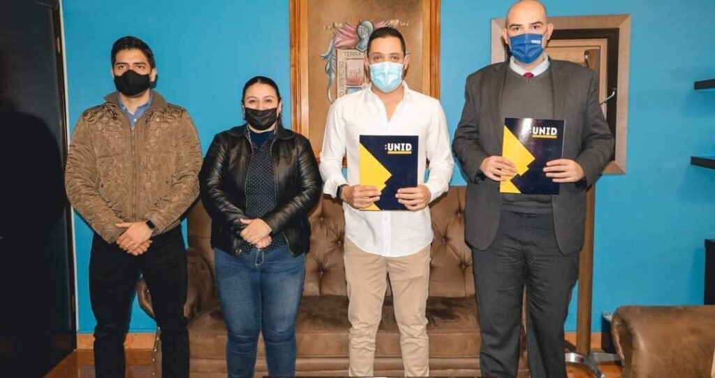 En la firma del convenio participaron el alcalde de Calvillo, Daniel Romo Urrutia, Cynthia Yolanda Olague Martínez, Secretaria de Gobernación, Edgar López Ochoa, Rector de la UNID Sede Aguascalientes, Adolfo Báez Estévez, Coordinador de Vinculación y Empleabilidad y Yanini Andrade del Área de Admisiones.