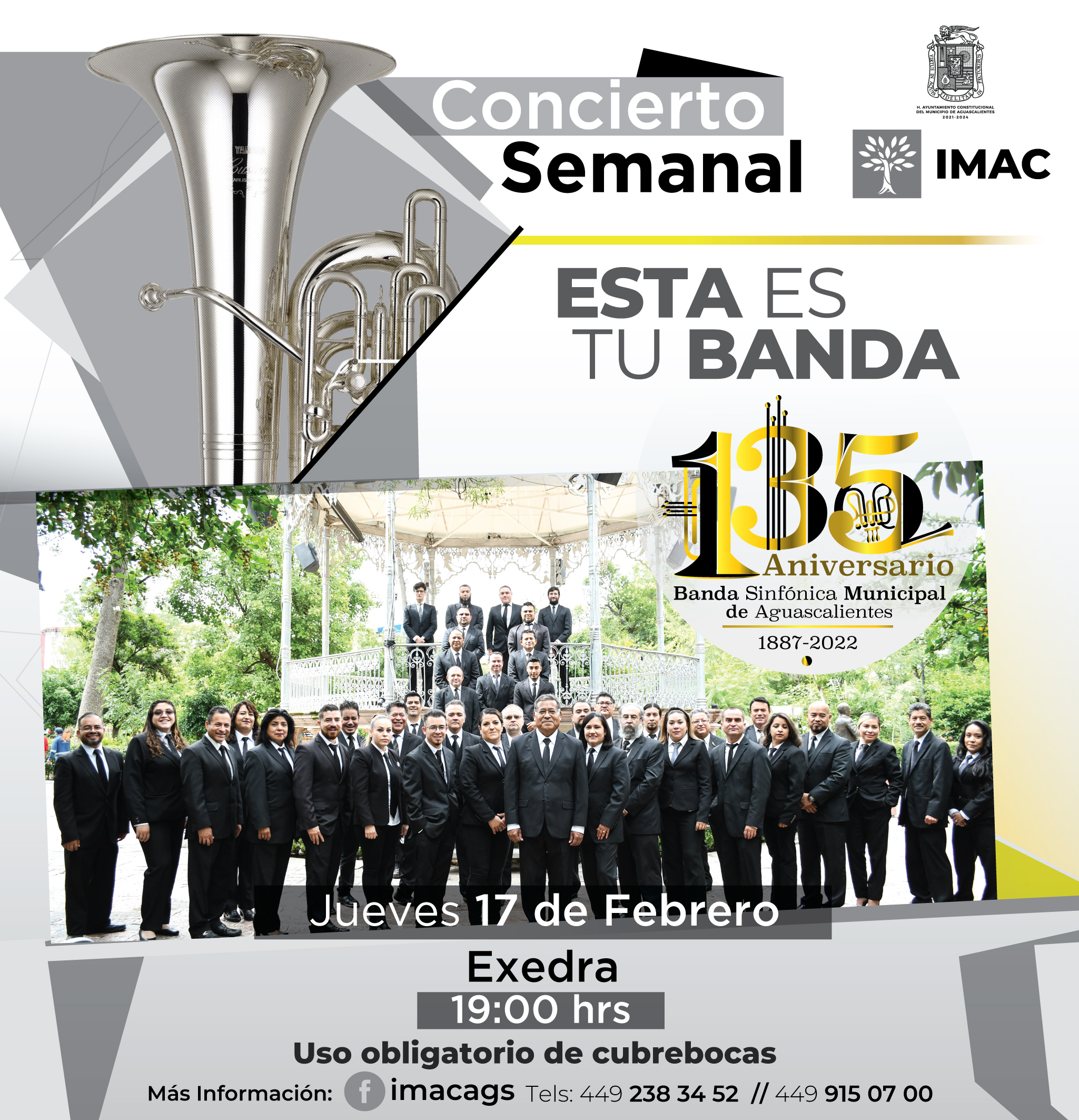 El Instituto Municipal Aguascalentense para la Cultura (IMAC) invita a celebrar el 135 Aniversario de la Banda Sinfónica Municipal con los conciertos semanales “Esta es tu Banda”, que se llevarán a cabo los jueves en la Exedra de la Plaza de la Patria, a las 19:00 horas, a partir de este 17 de febrero.