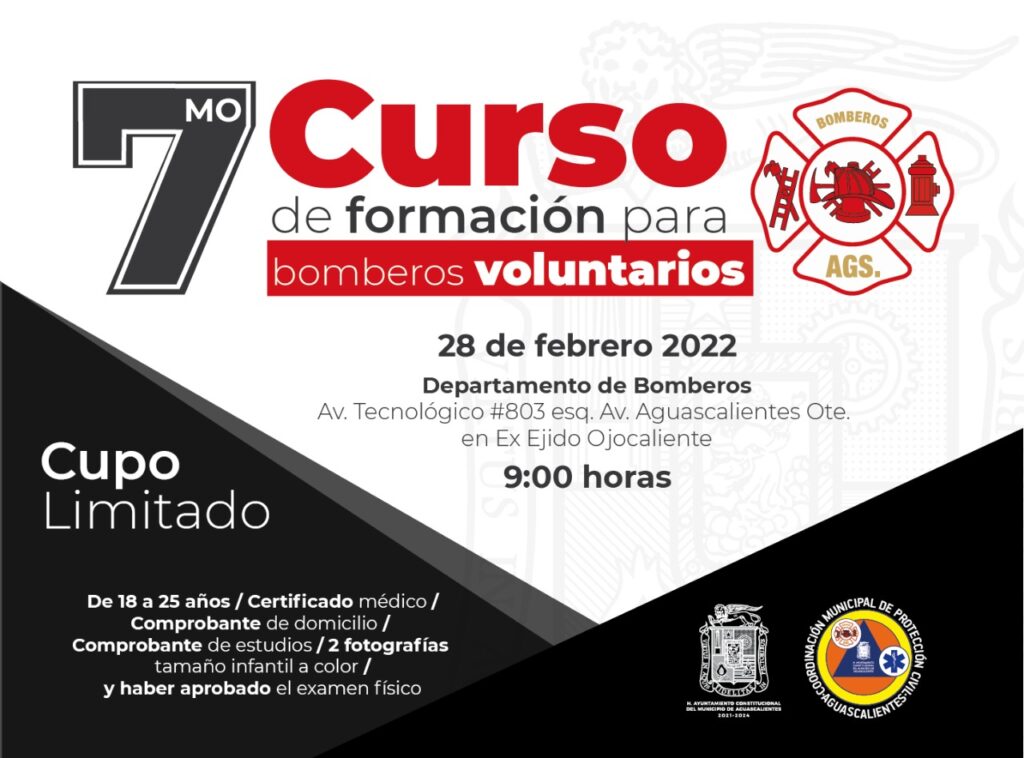 La Coordinaci贸n Municipal de Protecci贸n Civil a trav茅s del Heroico Cuerpo de Bomberos del Municipio de Aguascalientes invita a participar en el s茅ptimo curso de formaci贸n para bomberos voluntarios, en el que instructores certificados impartir谩n talleres gratuitos en materia de prevenci贸n y seguridad.