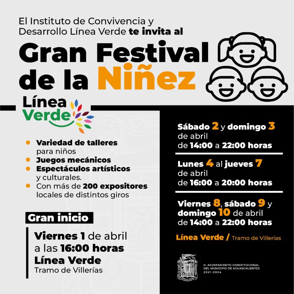 El Municipio de Aguascalientes invita a celebrar a los pequeños en el Mes de la Niña y el Niño, del 1 al 10 de abril. El Instituto de Convivencia y Desarrollo Línea Verde, preparó un festival en el que habrá diversión y sano esparcimiento, con actividades y talleres exclusivos.
