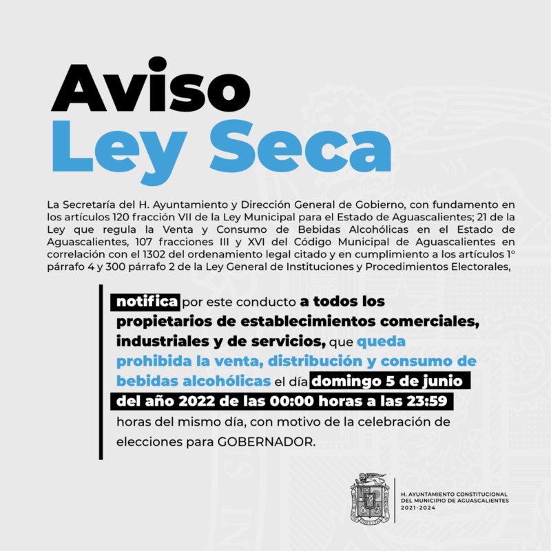 La Secretaría del H. Ayuntamiento y Dirección General de Gobierno notificó a todos los propietarios de establecimientos comerciales, industriales y de servicios que se prohibirá la venta, distribución y consumo de bebidas alcohólicas el próximo domingo 5 de junio del presente año, a partir de las 00:00 horas hasta las 23:59 horas del mismo día. Cabe recordar que en esa fecha se celebrarán las elecciones para escoger a la gobernadora de Aguascalientes.