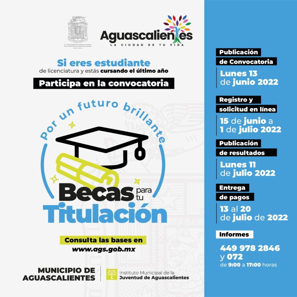 Los interesados en recibir la beca para titulación, podrán checar la convocatoria en el portal www.ags.gob.mx , https://ags.gob.mx/publicidad/CONV%20BECAS%20DE%20TITULACION.pdf