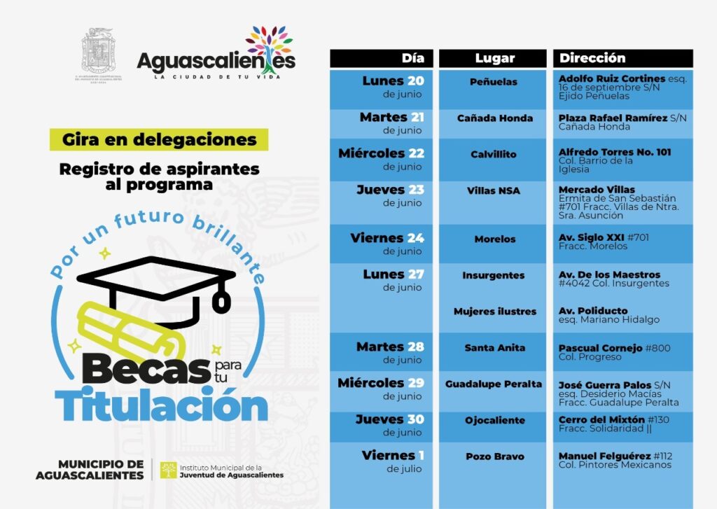 Los interesados en recibir la beca para titulaci贸n, podr谩n checar la convocatoria en el portal聽www.ags.gob.mx聽, o dando CLIC AQU脥 del 15 de junio al 1 de julio de 2022 y de esta forma registrarse en l铆nea o bien聽 comunicarse al 449 978 2846 y al 072, de 9:00 a 17:00 horas o a trav茅s del Facebook del IMJUVA; los resultados se dar谩n a conocer el lunes 11 de julio a trav茅s del mismo sitio y redes sociales oficiales del Municipio.