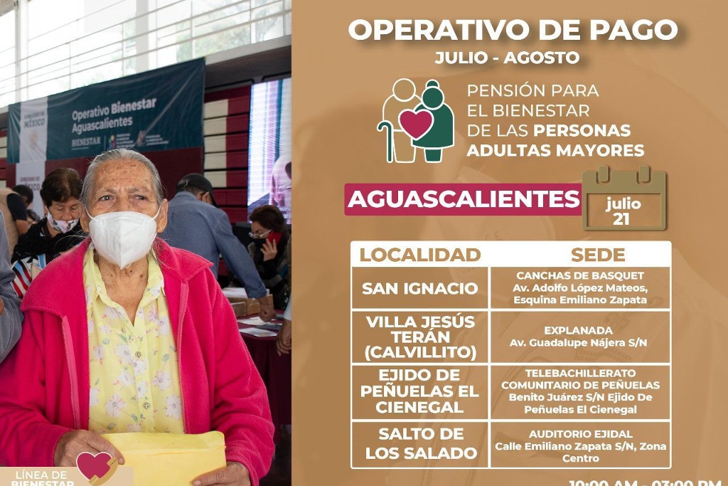 La delegación de la Secfretaría del Bienestar en Aguascalientes, informa que el pago de la pensión para adultos-mayores, luego de estar presente en algunos municipios del interior, llega a la capital, con el operativo correspondiente al mes de julio-agosto, por lo que ahora los modulos estarán presentes en el municipio capital y localidades aledañas. El pago, es para: