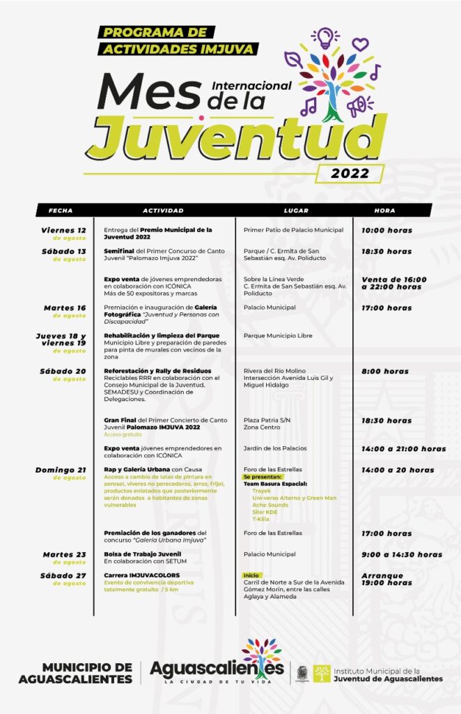 La Presidencia Municipal de Aguascalientes dio a conocer las actividades que se llevarán a cabo durante agosto para conmemorar el Mes de la Juventud, a través de las cuales se reconoce e impulsa el talento, habilidades y se abren espacios de expresión y ventanas de oportunidad para este sector que representa más del 30 por ciento de la población en la entidad.