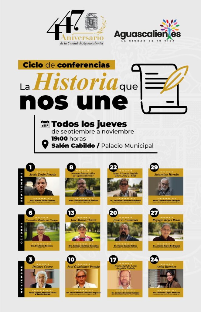 La mañana de este jueves, el Ayuntamiento de la capital a través del Instituto Municipal Aguascalentense para la Cultura (IMAC), presentó en rueda de prensa «La Historia que nos une», ciclo de conferencias que se ofrecerán para difundir y resaltar el legado de personajes destacados en la historia de Aguascalientes.