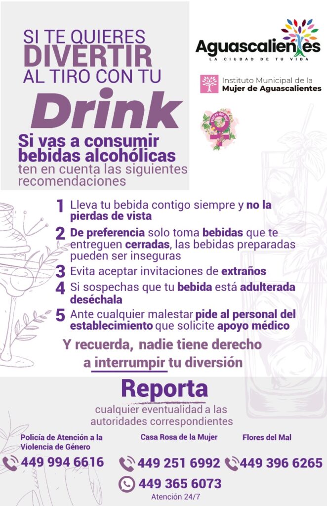 La Presidencia Municipal a través del Instituto Municipal para la Mujer de Aguascalientes (IMMA) arrancó la segunda fase de la campaña de concientización y autocuidado «Al Tiro con tu Drink», cuya finalidad es orientar a las mujeres y prevenir sean víctimas del consumo de bebidas adulteradas.