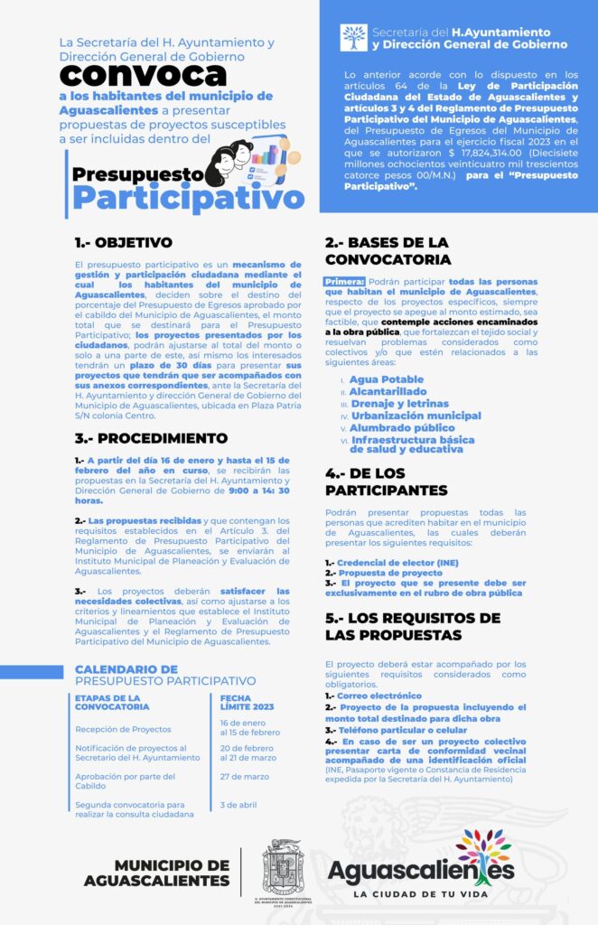 Podrán participar todas las personas que habitan el municipio de Aguascalientes, tendrán un plazo de 30 días para presentar sus proyectos, desde el día 16 de enero y hasta el 15 de febrero del año en curso, se recibirán las propuestas en la Secretaría del H. Ayuntamiento y Dirección General de Gobierno de lunes a viernes, de 9:00 a 14:30 horas.
