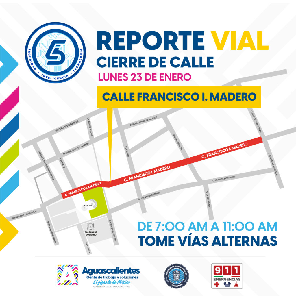El Gobierno del Estado de Aguascalientes informa que el próximo lunes 23 de enero de 2023, la calle Francisco I. Madero permanecerá cerrada desde su cruce con la calle Zaragoza hasta su cruce con la calle Guadalupe Victoria, de las 07:00 a las 11:00 horas, toda vez que se llevarán a cabo algunas actividades en esa zona del centro de la ciudad.