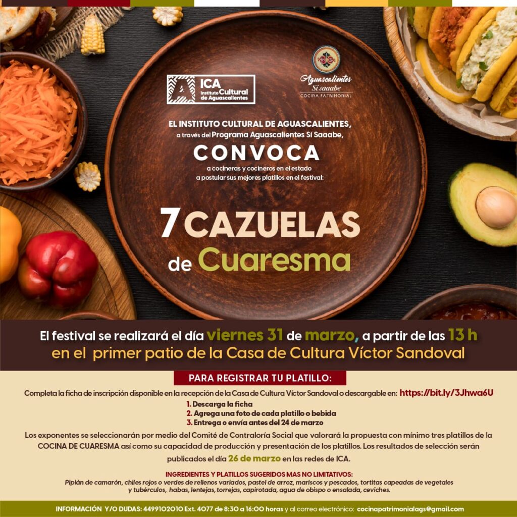El Instituto Cultural de Aguascalientes (ICA), a través del programa “Aguascalientes sí Saaabe”, convoca a cocineras y cocineros del estado a postular sus platillos para participar en el festival “7 Cazuelas de Cuaresma”, que se realizará el viernes 31 de marzo a partir de las 13:00 horas en el primer patio de la Casa de Cultura “Víctor Sandoval”.