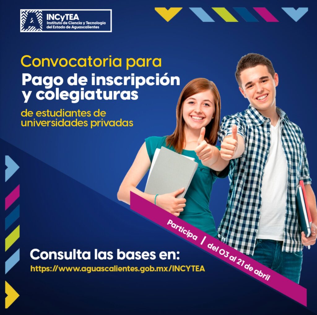 Con el objetivo de impulsar a las y los jóvenes de Aguascalientes a continuar sus estudios, el Instituto de Ciencia y Tecnología del estado de Aguascalientes (Incytea), lanzó la Convocatoria para el Pago de Colegiaturas e Inscripciones de Técnico Superior Universitario, Licenciaturas e Ingenierías de Universidades Privadas, que estará vigente hasta el 21 de abril de este año.