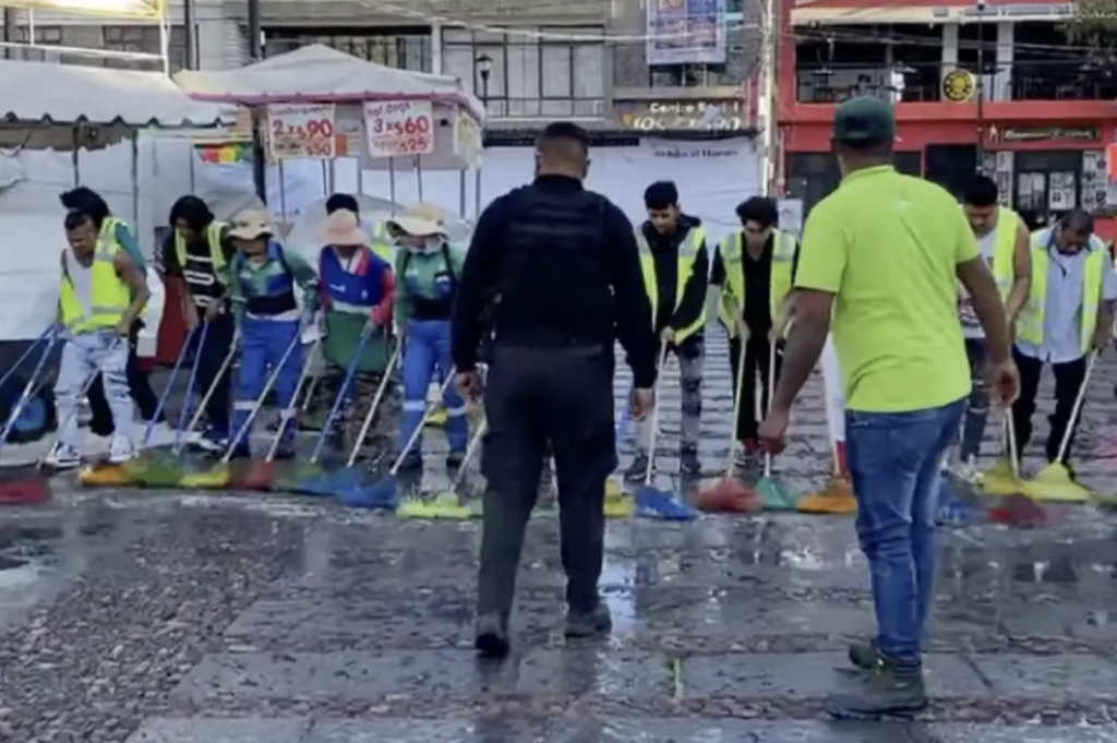“Con esto, tenemos una explanada más limpia. Y sobretodo decirles que seguiremos trabajando en el servicio comunitario, esto lo que genera es que las personas que cometen una falta administrativa pues puedan pagar esa falta, y en lugar de estar detenidos, que haya servicio a la comunidad, en bajo puentes, en lo que son parques y jardines, y aquí en la feria, trabajando en la explanada.”
