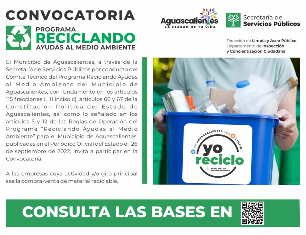 El Municipio de Aguascalientes a través de la Secretaría de Servicios Públicos, presenta la convocatoria para que empresas recicladoras participen en el programa “Reciclando ayudas al medio ambiente”, en donde se elegirá a la encargada de dar correcta disposición a los residuos reciclables.