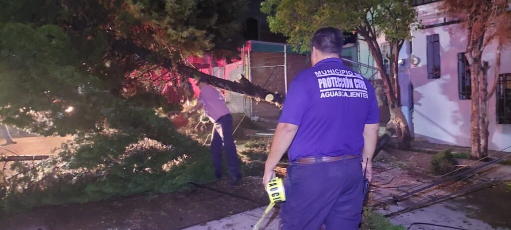 Acompa帽ados por trabajadores de la Secretar铆a de Servicios P煤blicos Municipales, la Coordinaci贸n Municipal de Protecci贸n Civil atendi贸 14 reportes, entre los que se encuentran 7 谩rboles ca铆dos en los fraccionamientos J. Guadalupe Peralta, Haciendas de Aguascalientes, Bosques, El Riego, Norias de Paso Hondo y en la curva de la UAA; 2 encharcamientos en las colonias San Pablo y Buenos Aires, un accidente vehicular, un veh铆culo da帽ado por 谩rbol, 2 postes ca铆dos en el fraccionamiento Haciendas de Aguascalientes y una malla cicl贸nica en riesgo de ca铆da en el fraccionamiento Arboledas.
