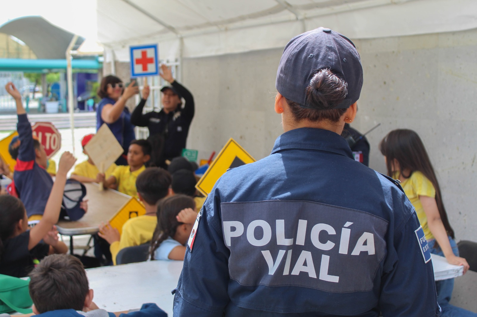 Como parte del programa “Retomemos nuestra cultura vial en Aguascalientes”, oficiales de la Policía Vial instruyen a las y los niños para que sepa distinguir los señalamientos preventivos, informativos y restrictivos; y además para que conozcan las figuras de autoridad y las leyes de vialidad.