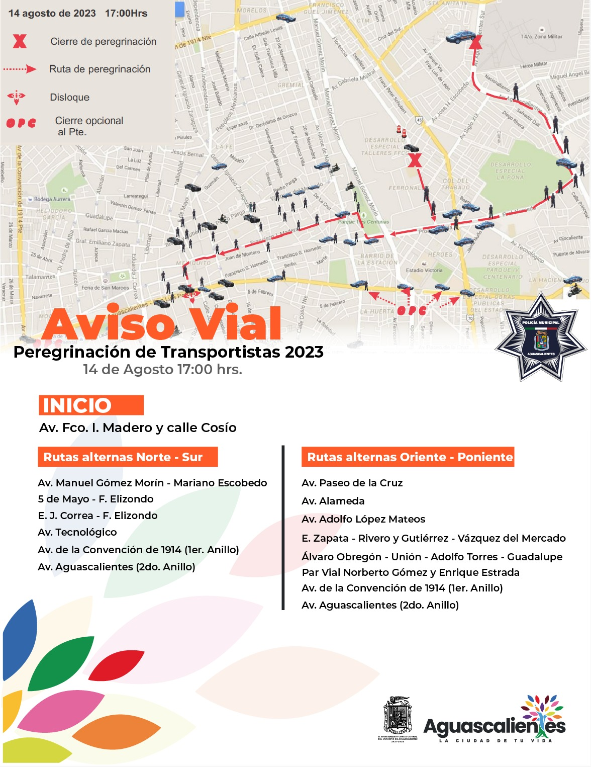 La Secretaría de Seguridad Pública Municipal de Aguascalientes, a través de la Dirección de Movilidad anuncia la implementación de un operativo vial con motivo de la peregrinación del sector transportista en honor a la Virgen de la Asunción, para salvaguardar la integridad física de los feligreses y preservar el orden y la paz pública.