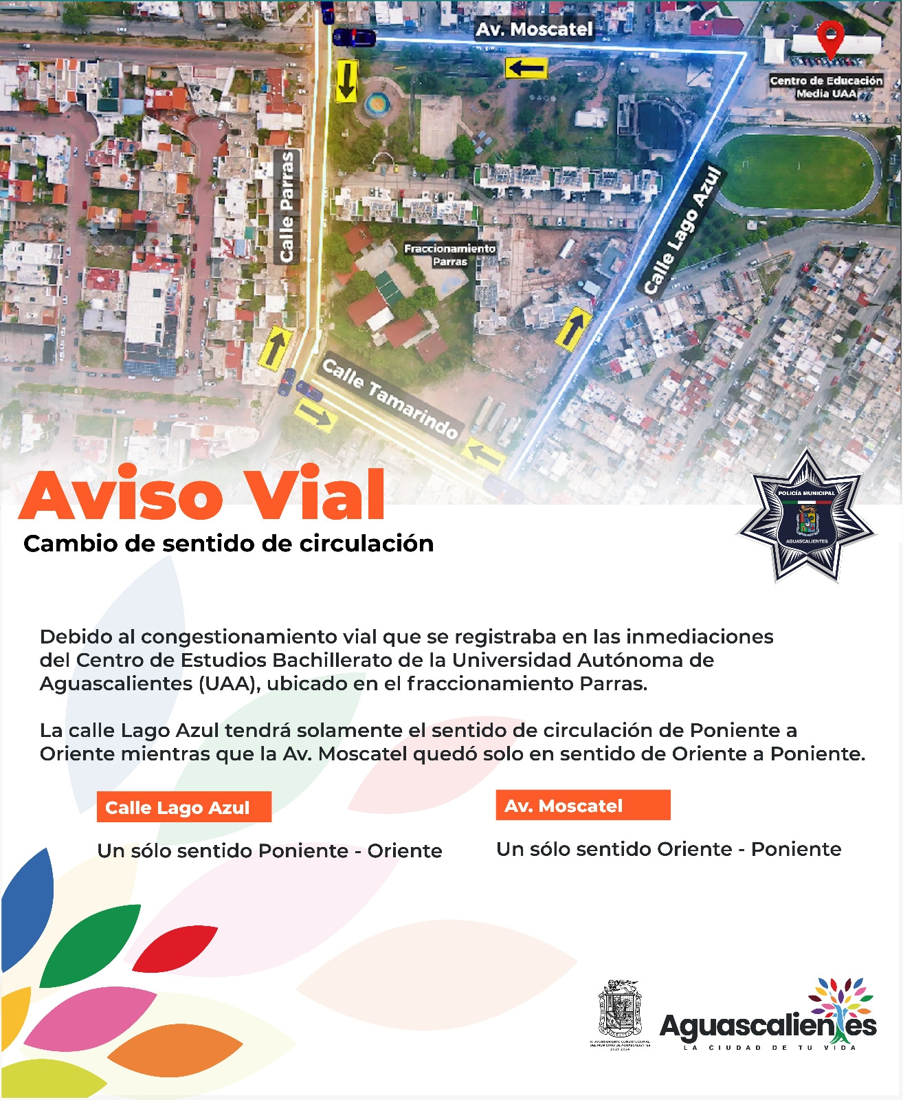El Municipio de Aguascalientes a través de la Dirección de Movilidad de la Secretaría de Seguridad Pública Municipal (SSPM), trabaja en cambios de circulación vehicular para que las calles Moscatel y Lago Azul ahora sean de un solo sentido y esto permita facilitar el tránsito para los alrededores del Centro de Educación Media UAA Bachillerato Central (BACHUAA), ubicada en el fraccionamiento Parras.