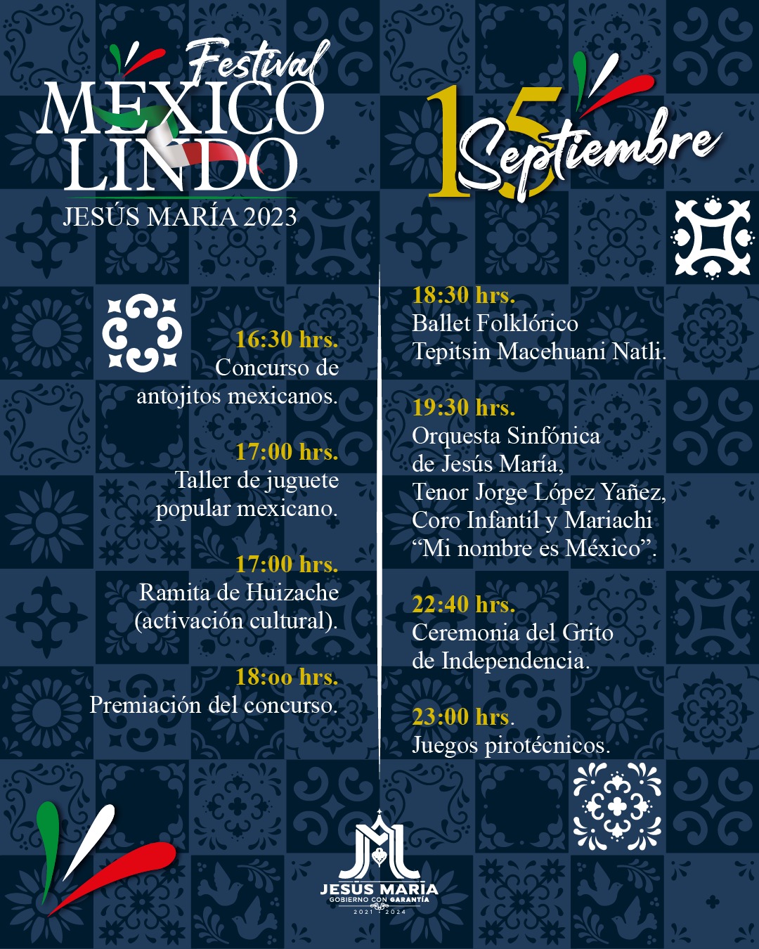 Con motivo de las fiestas patrias y para arraigar entre la población las tradiciones mexicanas, el Municipio de Jesús Marías, a través de la Instancia de Cultura, prepara el Festival México Lindo 2023 a realizarse del 15 al 17 de septiembre, informó Flor Zavala Soto.