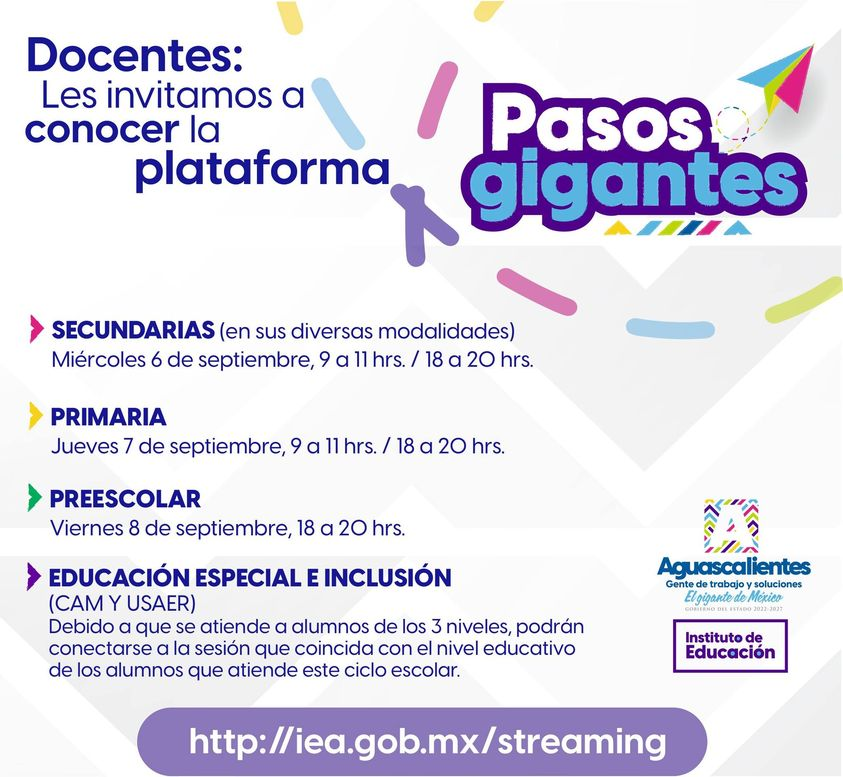 El Instituto de Educación de Aguascalientes (IEA) realizará una serie de sesiones en línea para que maestras y maestros se capaciten sobre los contenidos y actividades de la plataforma Pasos Gigantes.
