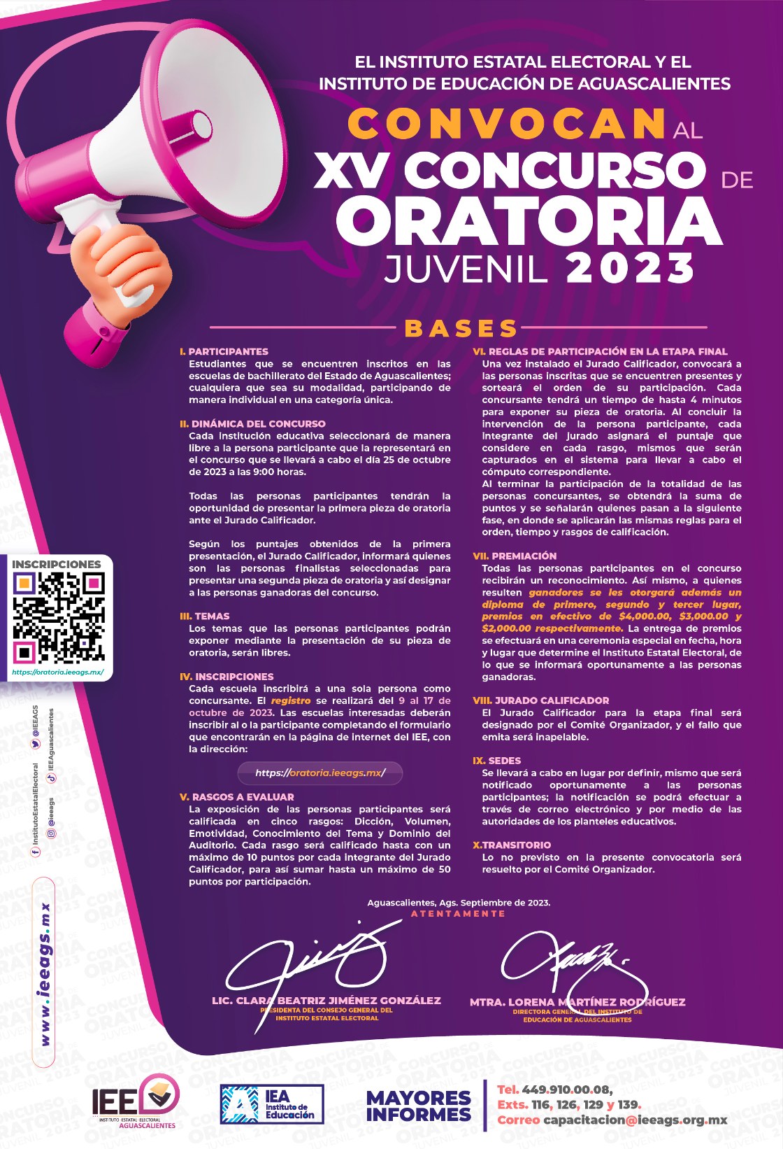 Consulta las convocatorias en: https://debatejuvenil.ieeags.mx y https://oratoriajuvenil.ieeags.mx.