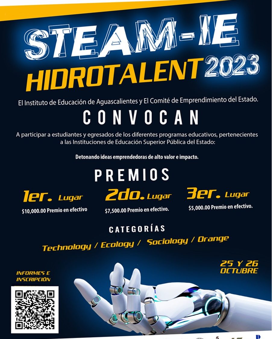 El Instituto de Educación de Aguascalientes (IEA) invita y recuerda a todos los estudiantes y egresados de todos los diferentes programas de educación de Aguascalientes que el día de hoy, viernes 6 de octubre, es la fecha límite de registro de tu proyecto emprendedor para participar en el STEAM-IE HIDROTALENT 2023, que se realizará los días 25 y 26 de octubre, en sus distintas categorías que son: Technology, Ecology, Sociology y Orange.