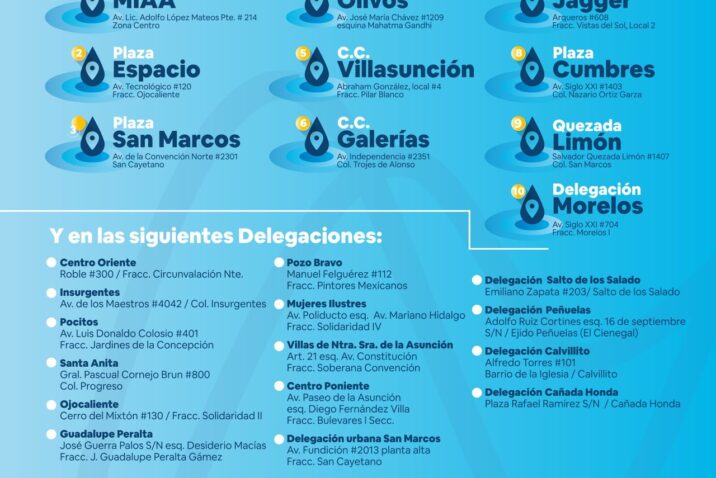 Jesús Vallín recordó que para acercar la atención a las personas hay 25 puntos de atención disponibles, en centros y plazas comerciales, así como en todas las Delegaciones Municipales, en el área urbana y rural, para que puedan acudir a la sede más cercana. Reiteró que se cuenta con la línea telefónica 073 y el Whatsapp 449 469 99 43 para realizar reportes.