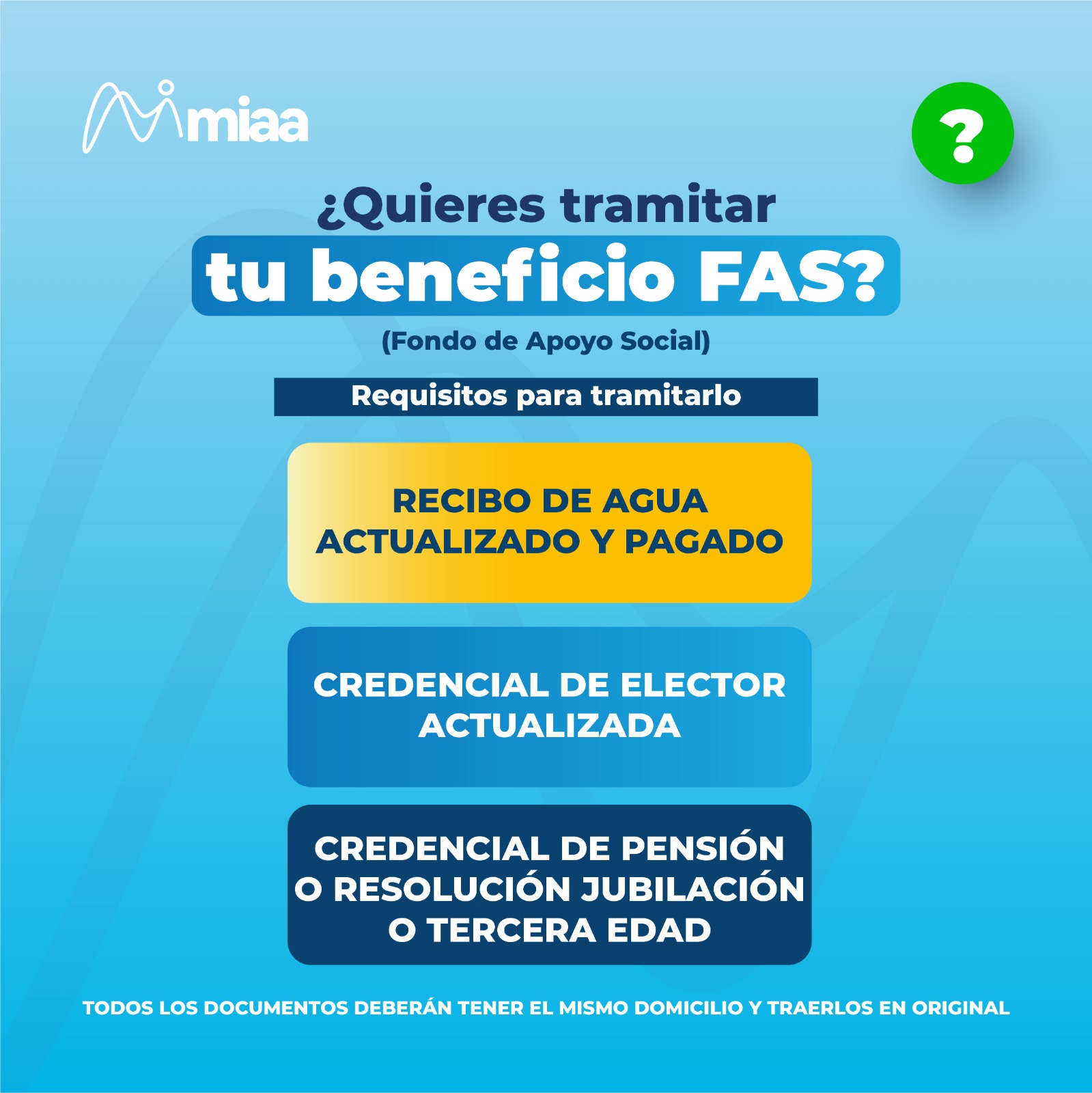 Con la finalidad de brindar un servicio humano y sensible a las necesidades de los sectores vulnerables de la sociedad en el servicio de agua potable, el Modelo Integral de Aguas de Aguascalientes (MIAA) continuará con el programa de Fondo de Apoyo Social (FAS), con descuentos en sus recibos mensuales.