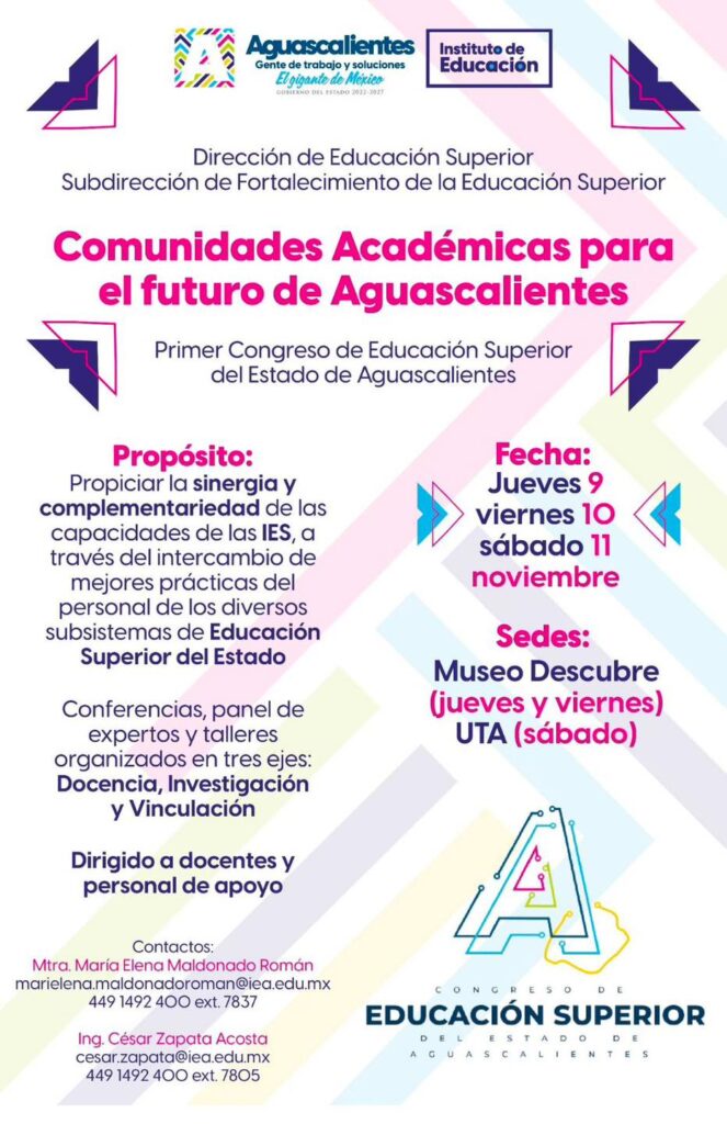 El Instituto de Educación de Aguascalientes (IEA), mediante su directora general Lorena Martínez, extendió una invitación para todos los docentes y personal de apoyo de las áreas académicas de universidades públicas y particulares de Aguascalientes a participar en el 1er. Congreso de Educación Superior del Estado de Aguascalientes.