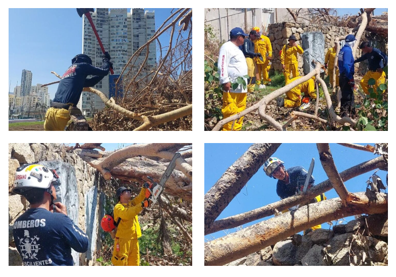 El titular de la Secretaría de Turismo de Guerrero, Santos Ramírez Cuevas, por conducto de la Secretaría de Gestión de Riesgos y Protección Civil, pidió el apoyo de brigadistas de Protección Civil Municipal Aguascalientes para eliminar riesgos en una extensión aproximada de una hectárea en el centro internacional de Acapulco, donde el huracán Otis derribó 50 árboles.
