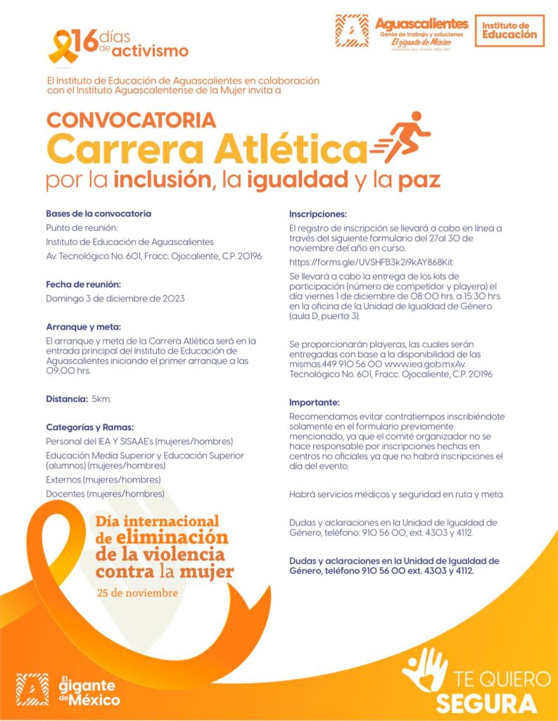 El Instituto de Educación de Aguascalientes invita a participar en la Carrera Atlética por la Inclusión, la Igualdad y la Paz, que se realizará el domingo 3 de diciembre a las 9 am. El punto de partida será el Instituto de Educación de Aguascalientes, en Av. Tecnológico 601, Fracc. Ojocaliente.