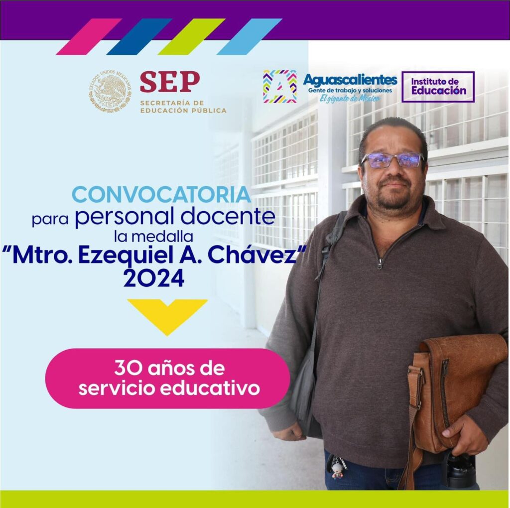 Este domingo, el Instituto de Educación de Aguascalientes(IEA) publicó en redes sociales la convocatoria para la medalla “Maestro Ezequiel A. Chávez 2024”, con la cual se busca reconocer a todas y todos los docentes con 30 años de servicio educativo.