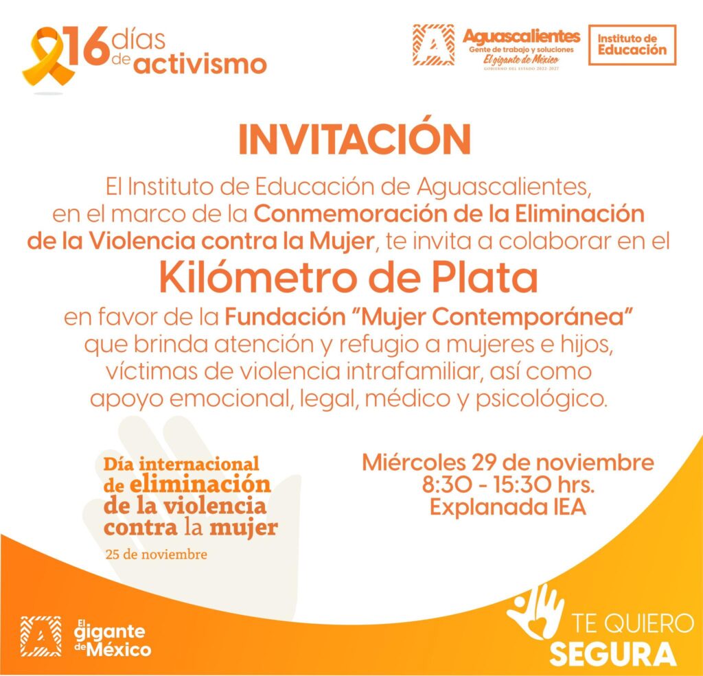 El instituto de Educación de Aguascalientes (IEA) invita a toda la comunidad educativa del estado a participar y colaborar en el “Kilómetro de Plata”, a favor de la Fundación “Mujer Contemporánea”, la cual ofrece refugio y apoyo emocional, legal, médico y psicológico a mujeres y a sus hijos, víctimas de violencia intrafamiliar.