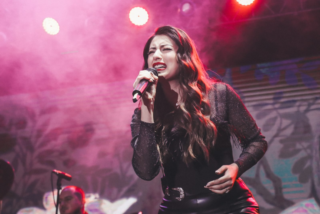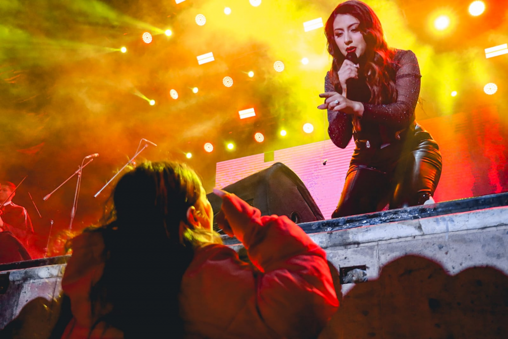 Durante su presentaci贸n interpret贸 canciones de amor y desamor acompa帽ada de banda y mariachi para complacer a las y los asistentes que se dieron cita para disfrutar de su talento.
