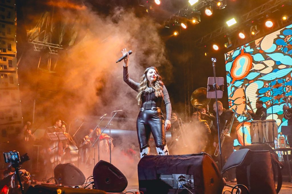 Durante su presentaci贸n interpret贸 canciones de amor y desamor acompa帽ada de banda y mariachi para complacer a las y los asistentes que se dieron cita para disfrutar de su talento.