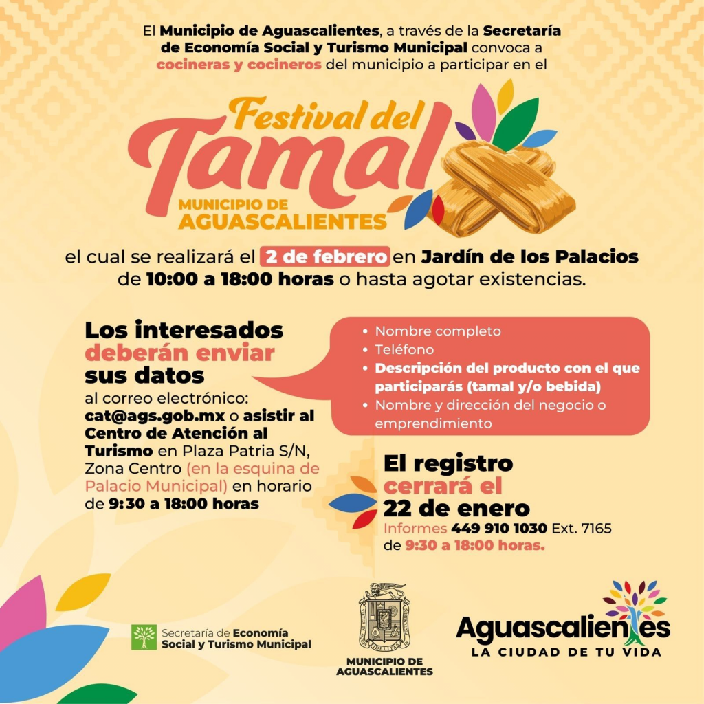 El Municipio de Aguascalientes, a través de la Secretaría de Economía Social y Turismo Municipal (Setum) lanzó la convocatoria para que todas las cocineras y cocineros puedan participar en el próximo Festival del Tamal, que se llevará a cabo el 2 de febrero, en el marco del Día de la Candelaria y con el que se busca celebrar la cultura y la riqueza gastronómica de nuestra ciudad.