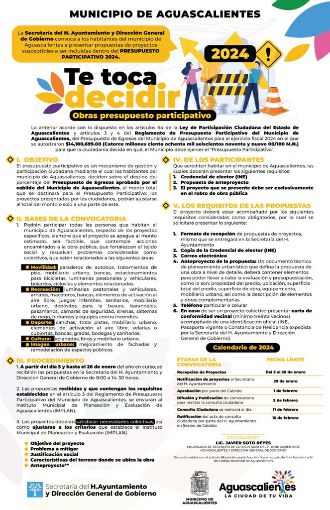 El Municipio de Aguascalientes lanzó este martes la convocatoria del Presupuesto Participativo 2024, denominada “Te Toca Decidir”, en el que la ciudadanía propone los proyectos que benefician de manera directa a sus colonias o comunidades.