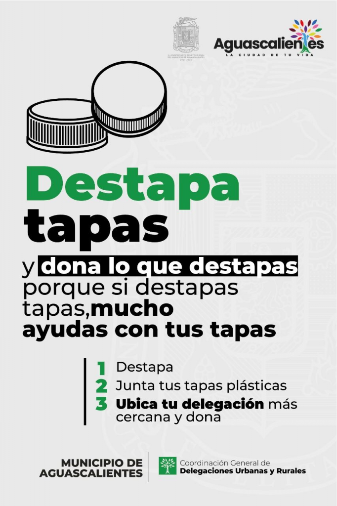 Por ello, se invita a la población a acudir, de lunes a viernes de las 8:30 a las 15:00 horas a alguna de las 16 delegaciones o a las oficinas de la Coordinación General de Delegaciones ubicada en José María Chávez #105, primer piso, Zona Centro, a llevar sus tapitas de plástico y botellas tipo pet.