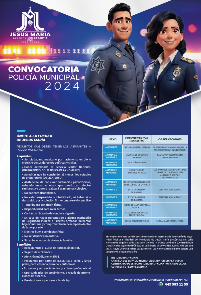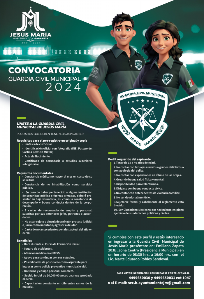 Con el objetivo de reforzar la seguridad, el Municipio de Jesús María invita a las y los jóvenes que tengan espíritu de servicio y vocación para proteger a la ciudadanía, a unirse a las filas de la Policía Municipal o de la Guardia Civil Municipal.