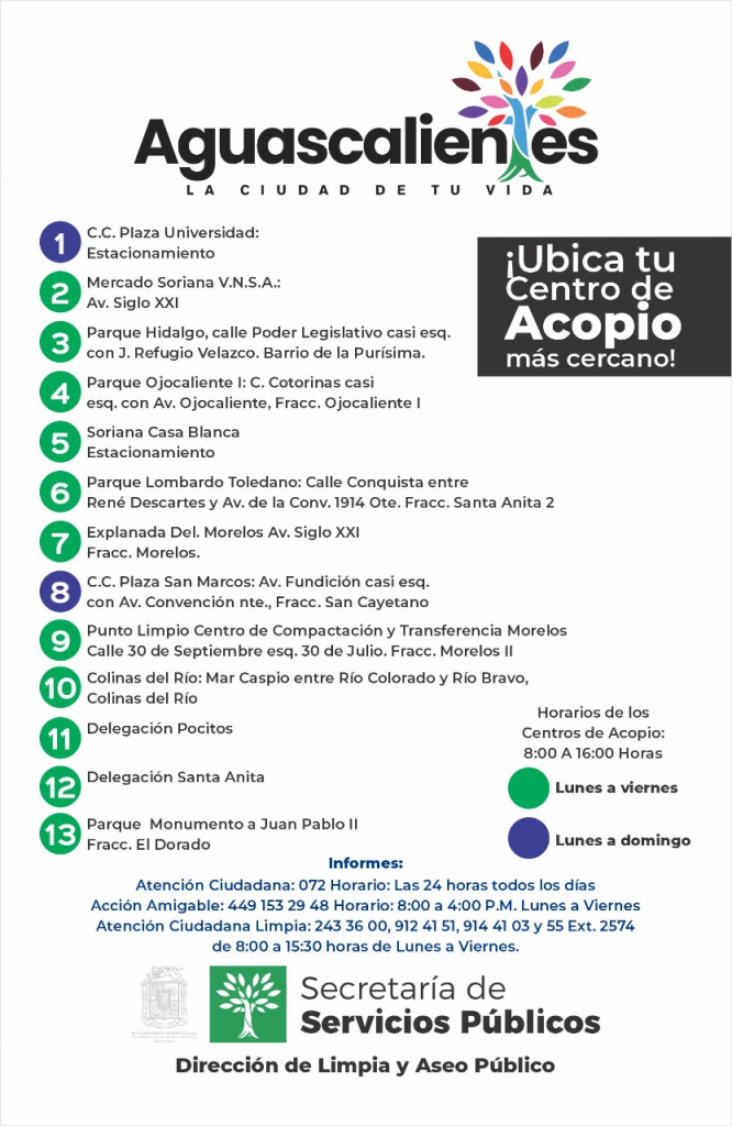 El Municipio de Aguascalientes reitera que están a disposición de la ciudadanía 13 Centros de Acopio para la correcta disposición de materiales reciclables y ayudar a disminuir la cantidad de residuos que se depositan en los contenedores y que llegan al relleno sanitario.