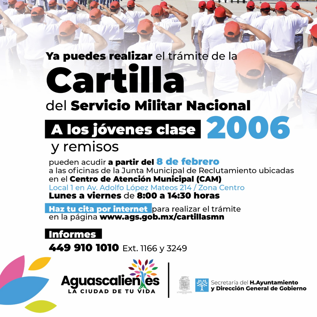 Se invita a los jóvenes y remisos a realizar su cita por internet en www.ags.gob.mx/cartillasmn; en donde encontrarán también los requisitos para que puedan obtener su documento, en el Centro de Atención Municipal (CAM), local 1, en López Mateos 214, zona centro, de lunes a viernes, de 08:00 a 14:30 horas.