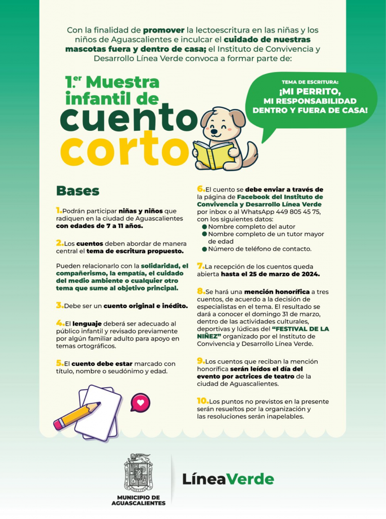 El Municipio de Aguascalientes a través del Instituto de Convivencia y Desarrollo Línea Verde, invita a participar en la Primera Muestra Infantil de Cuento Corto, a través de la cual se promueve la lectoescritura en niñas y niños de Aguascalientes y se inculca la responsabilidad del cuidado de las mascotas fuera y dentro de casa.