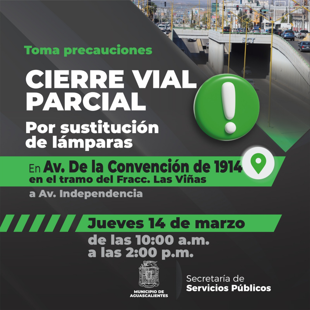 Este jueves 14 de marzo se realizará el cierre parcial a la circulación de los carriles centrales de Av. De la Convención Norte, desde Av. Héroe de Nacozari y hasta Av. Independencia, para permitir a personal de la Dirección de Alumbrado Público llevar a cabo trabajos de cambio de luminarias en las zonas de los bajopuentes, que permitan una mejor visibilidad para los conductores.