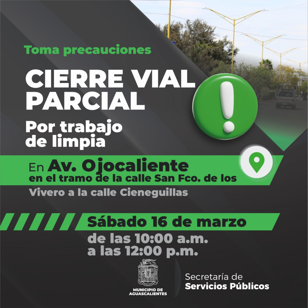 Este sábado 16 de marzo, la Secretaría de Servicios Públicos realizará cierres parciales a la circulación en los arroyos viales de Av. Ojocaliente, desde la calle San Francisco de los Viveros y hasta el cruce con la calle Cieneguillas, para realizar trabajos de limpieza en camellón y accesos peatonales en la zona.