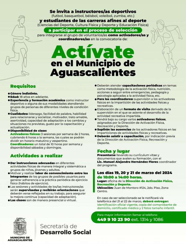 El Municipio de Aguascalientes invita a instructores/as deportivos de futbol, basquetbol, béisbol, voleibol, zumba, entre otros y a estudiantes de las carreras afines al deporte como Ciencias del Deporte, Cultura Física y Deporte y Educación Física, a participar en el proceso de selección para integrarse al grupo de voluntarios/as como activadores/as y coordinadores/as y participar en la convocatoria Actívate en el Municipio de Aguascalientes.