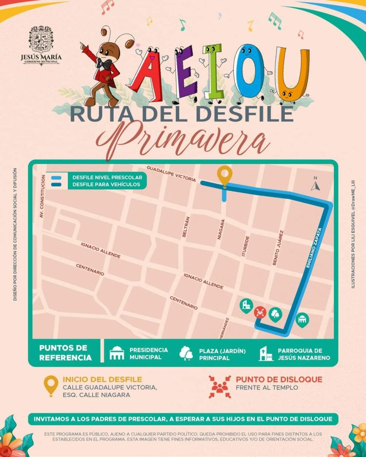 El Gobierno de Jesús María a través de la Secretaría de Seguridad Pública y Vialidad Municipal informa a la ciudadanía que el día 21 de marzo habrá cierres viales debido a que se llevará a cabo el desfile de primavera.