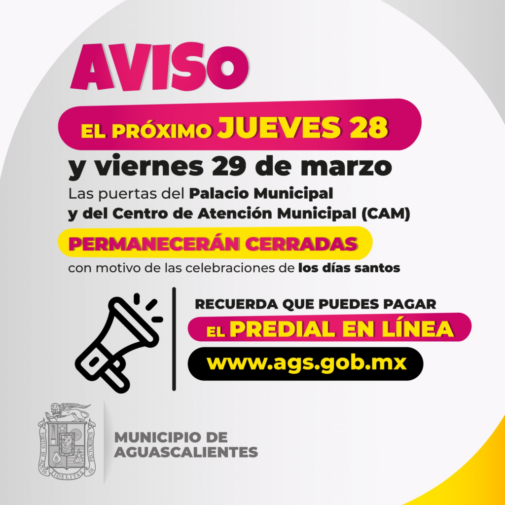 Asimismo, se informa a la ciudadanía que con motivo de la Semana Santa el jueves 28 y viernes 29 de marzo, el CAM y las oficinas de Palacio Municipal permanecerán cerradas.