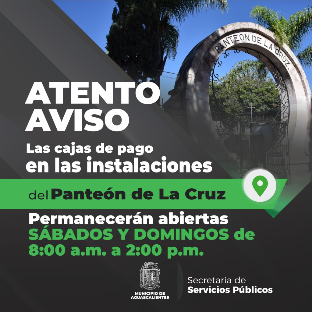 La Secretaría de Servicios Públicos del Municipio de Aguascalientes invita a la ciudadanía a acercarse a la caja de Finanzas ubicadas en las oficinas del panteón de la Cruz, misma que ofrece servicio los fines de semana.